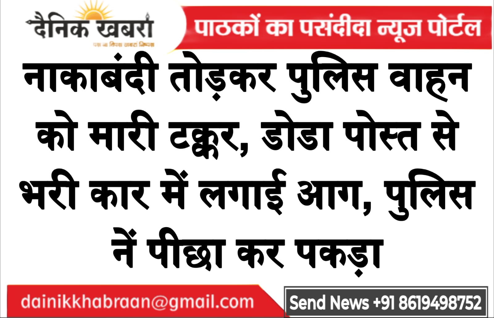 नांकाबंदी तोड़कर पुलिस वाहन को मारी टक्कर, डोडा पोस्त से भरी कार में लगाई आग — आरोपी गिरफ्तार