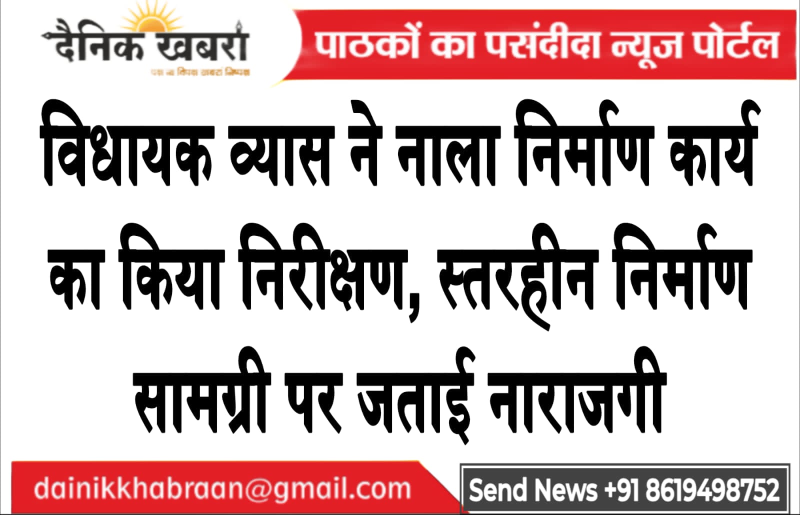 विधायक व्यास ने नाला निर्माण कार्य का किया निरीक्षण, स्तरहीन निर्माण सामग्री पर जताई नाराजगी