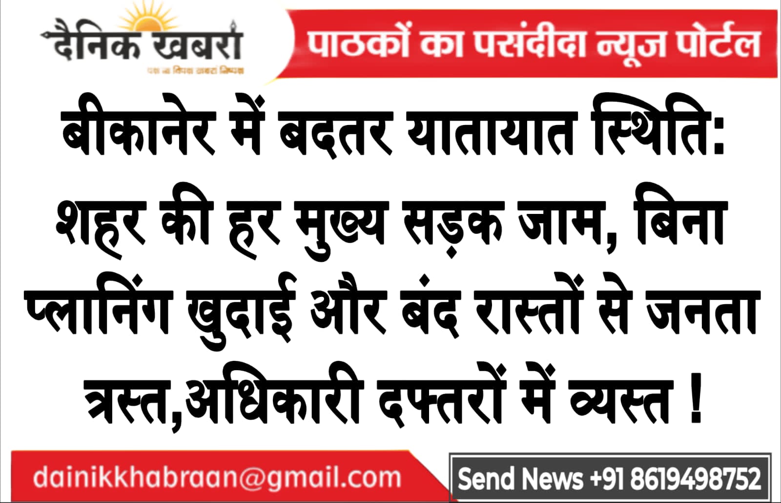 बीकानेर में बदतर यातायात स्थिति: शहर की हर मुख्य सड़क जाम, बिना प्लानिंग खुदाई और बंद रास्तों से जनता त्रस्त,अधिकारी दफ्तरों में व्यस्त!